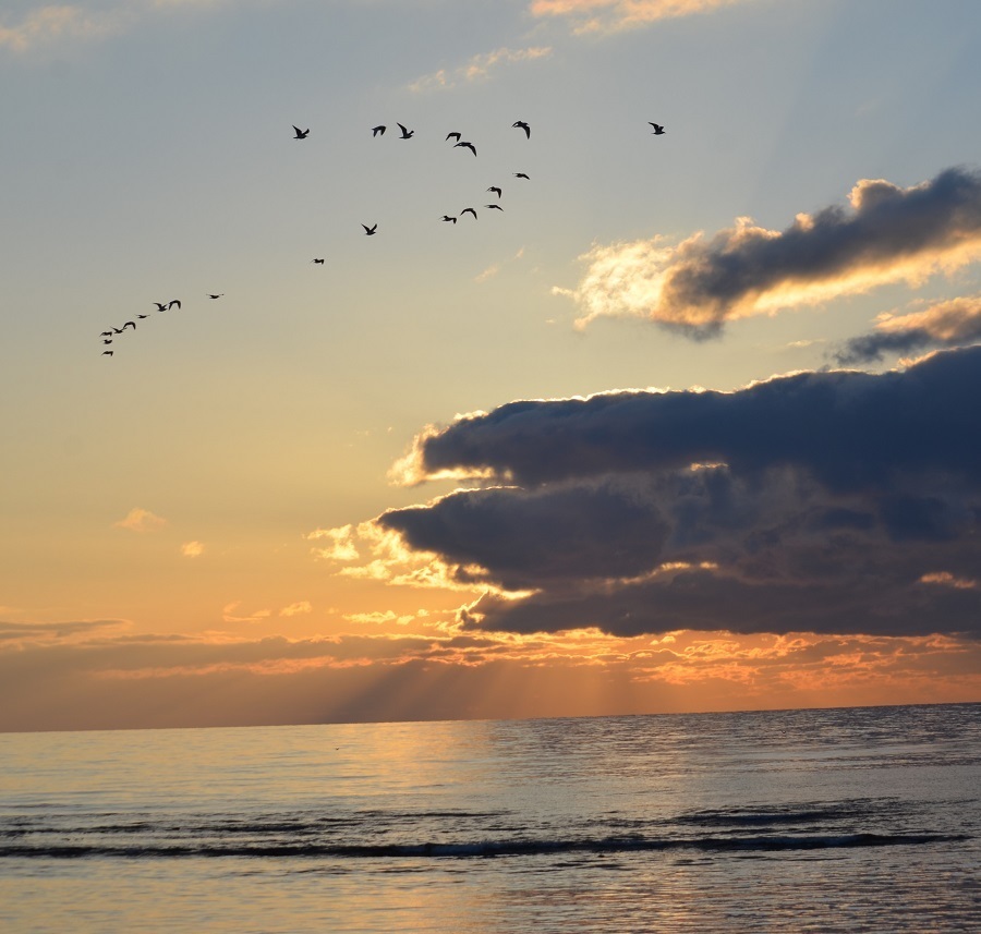 (注記) 舞台がお終いになる時に緞帳が下りているような雲が視え、輝く夕陽がその奥へ去って行きますが、暗い海の上に光る花道が出来ているようです。
