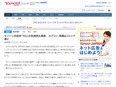 カプコンは27日、昨年9月に発売して3カ月足らずで400万本を販売したゲームソフト「モンスターハンター4」(モンハン4)の続編である「同4G」を今年秋に発売すると発表した。東京株式市場ではこの発表が大きく材料視され、カプコン株が一気に値幅制限いっぱいまで値上がりし、一時ストップ高となった。