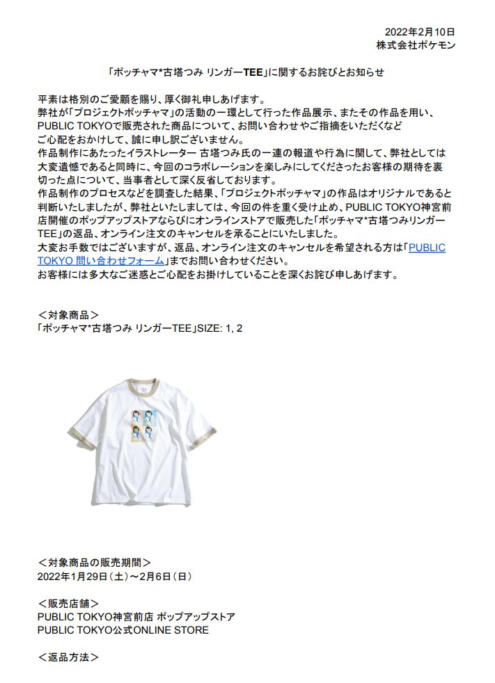 「ポッチャマ*古塔つみ リンガーTEE」に関するお詫びとお知らせhttps://t.co/bFZLHA18WI