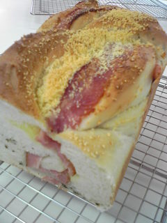 生地の中にバジルとガーリックパウダーが入っていて、ベーコンを巻き込んで焼いているのです。