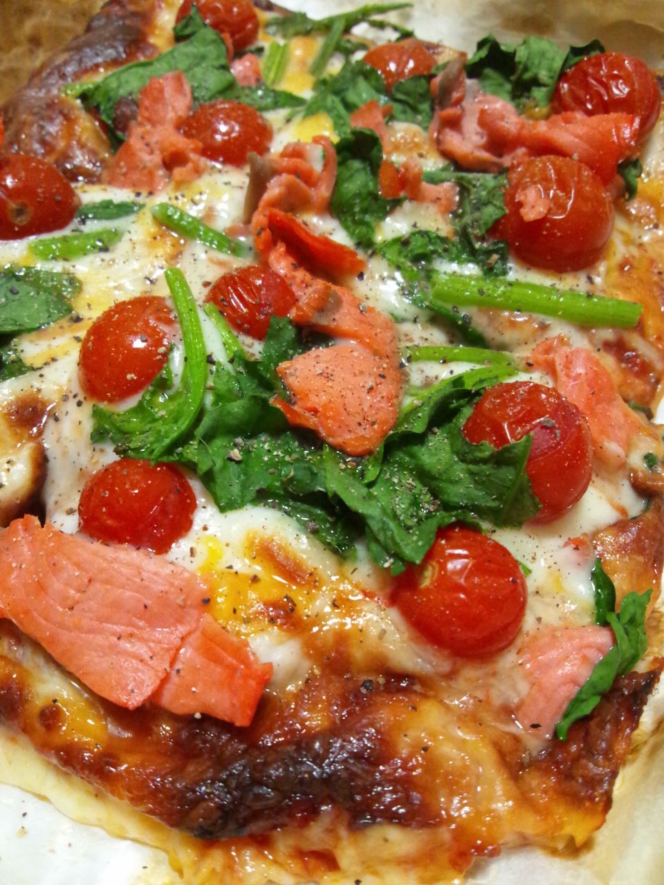 プチトマト、スモークサーモン、ホウレン草を乗せて焼いたら