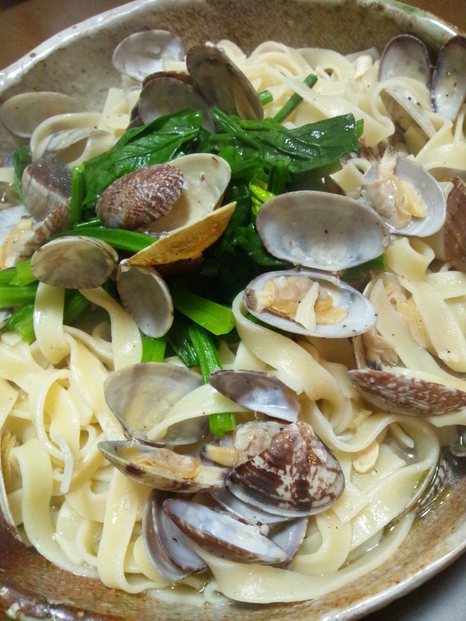 2、砂だし、擦り洗いしたあさりを白ワイン蒸し