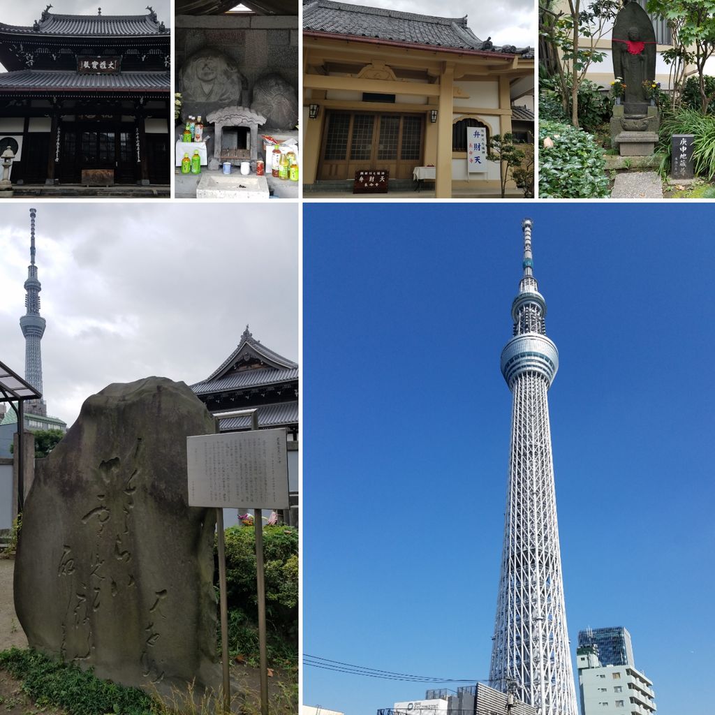 晴天の中そびえ立つスカイツリーに弘福寺。長命寺。