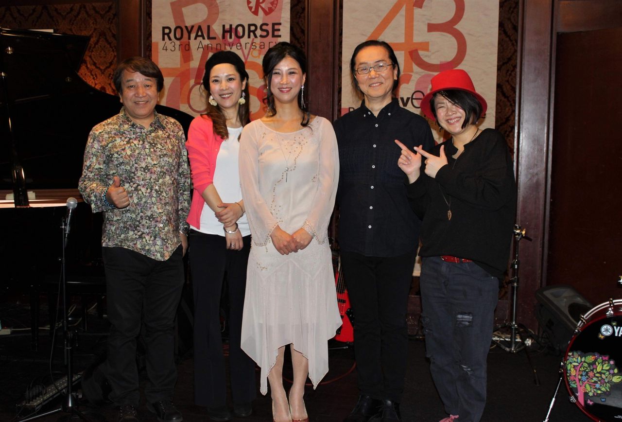 ←からピアノ佐伯準一。サックス足立藍子。わたし。ベース水野正敏。ドラム渡邉愛子。