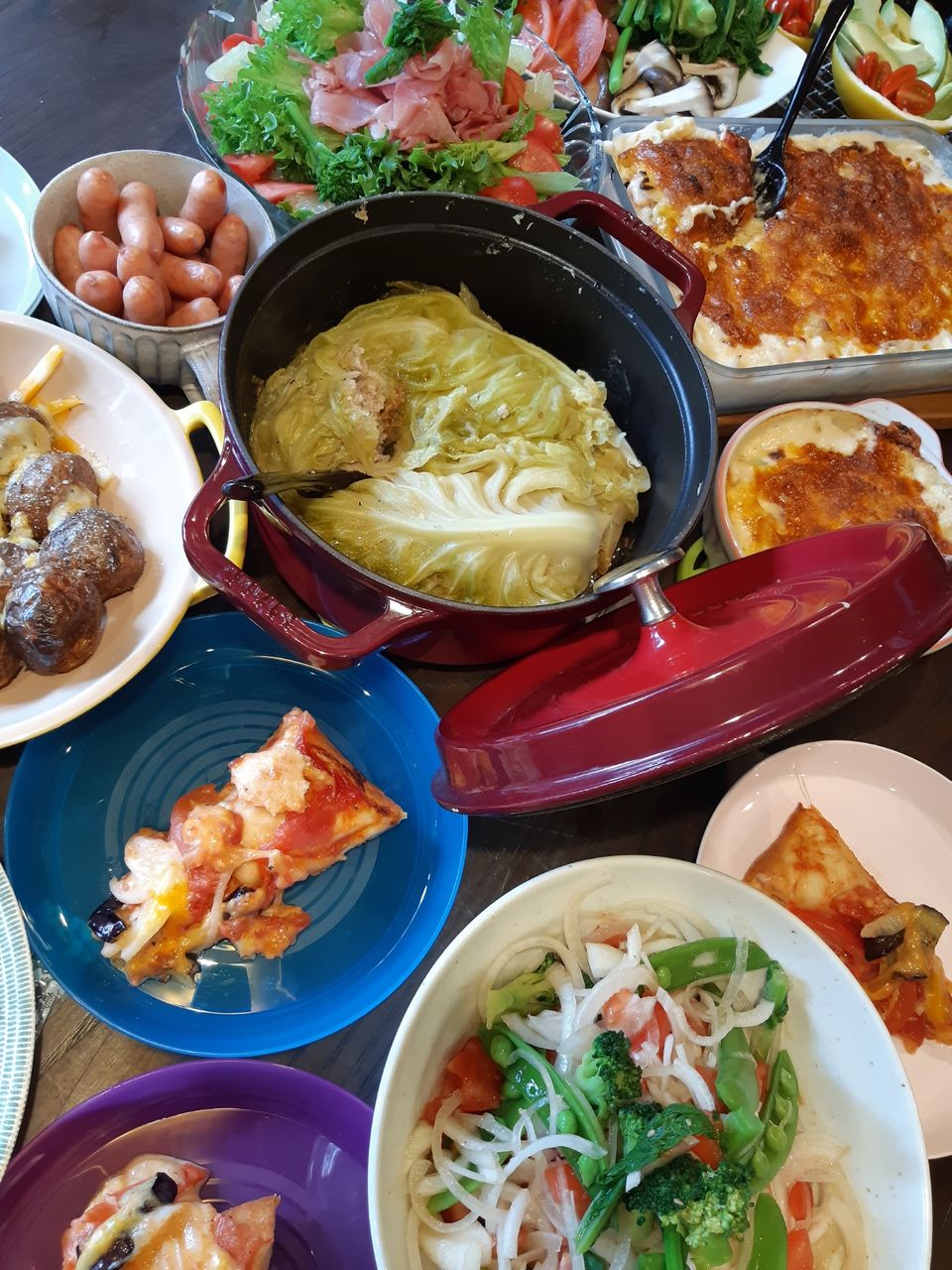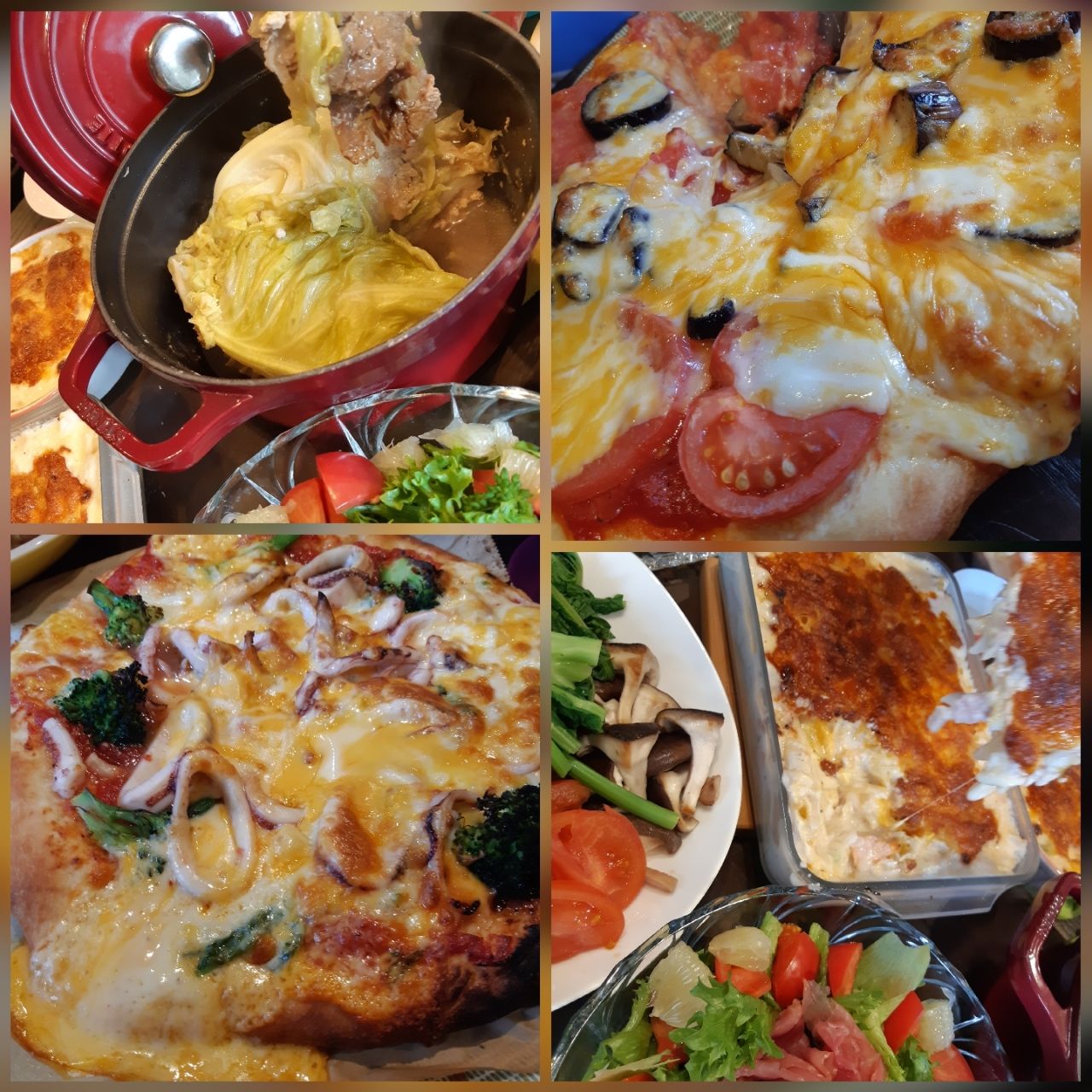 新玉サラダ☆ボンタン生ハムサラダ☆菜の花スティックサラダ☆茄子トマトピザ☆シーフードピザ☆グラタン☆ミルフィーユロールキャベツ☆新じゃがポテト