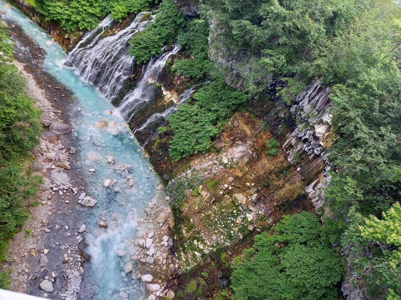美瑛川に置かれたブロック堰堤に白ひげの滝から