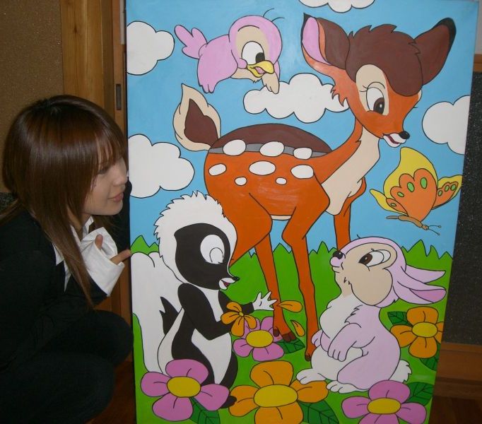 これは高校の頃に選択美術の時間にDisneyのバンビが大好きだから描いた絵で、葵が横にどっしり写ってますがこの絵もなかなか大きいんですよんヽ( ?▽`;)/====3=3=3 ウヘヘーン♪東京に持ってきたかったけど大きすぎて断念ΣΣ┏(_□しろいしかく_:)┓