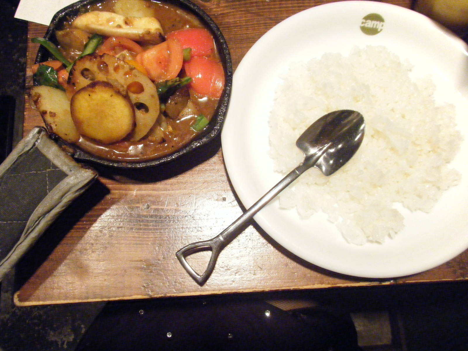 代々木にあるCanpってゆうカレー屋さん店名の通りキャンプちっくにスプーンがスコップの形してて、店内もアウトドアな感じ1日分の野菜が摂取できる野菜てんこもりのカレーがお気に入りなのだ