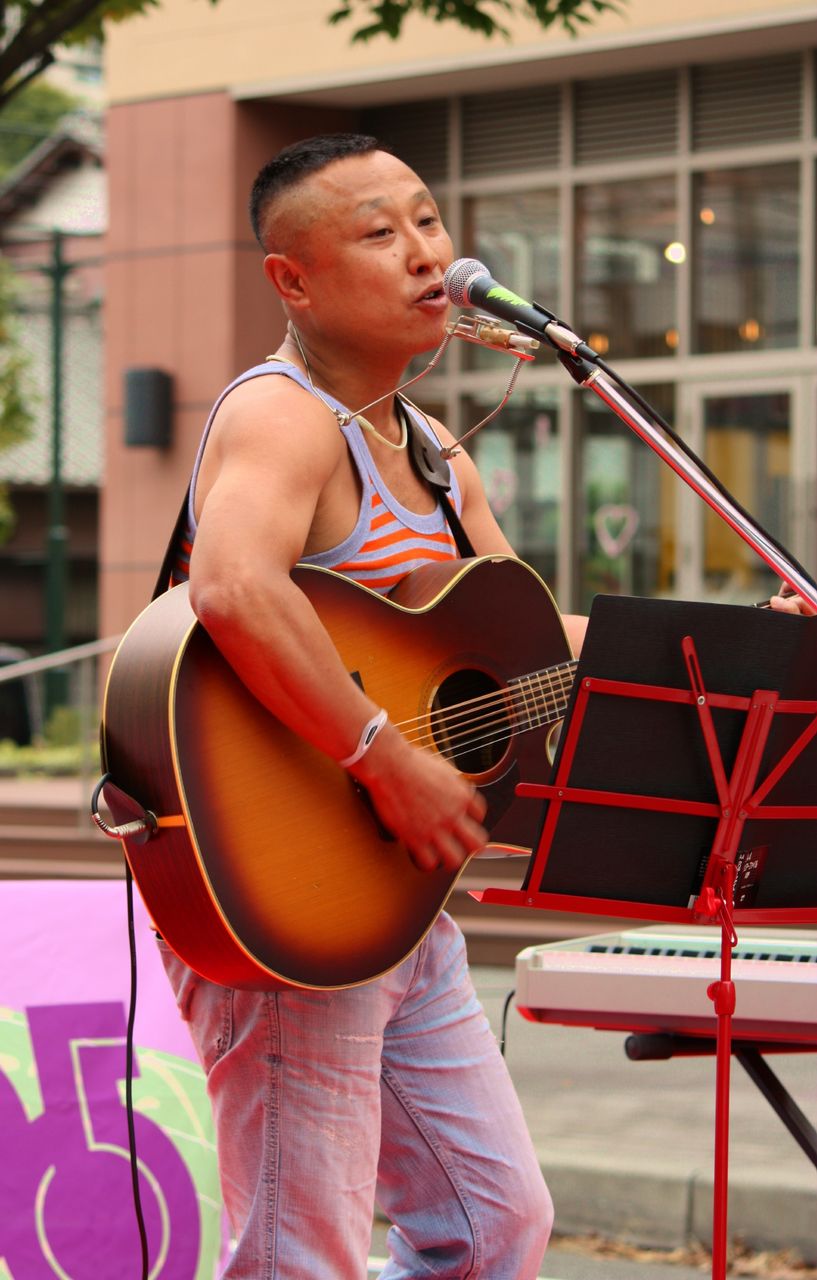 私達が沼津でライブをする時にお世話になっていたライブバー沼津P-STAGEのマスターでした。今回初めて藤枝にお越しくださり、すごく嬉しかったです!しょっぱな「四十路」の歌で飛ばして、会場をあたためてくれました。いつもタンクトップが衣装なんですが、この日はヨコシマ柄だー♪よこぴー出演時は、タンクトップもお楽しみにひとつ