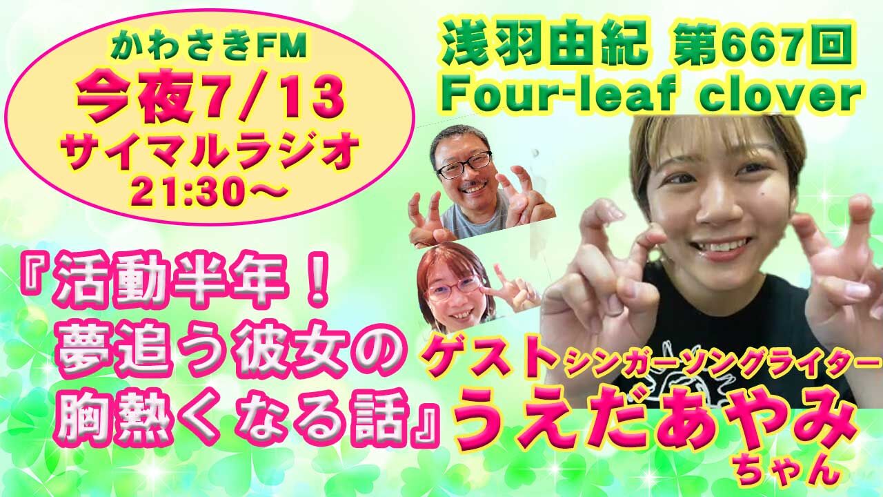 【 ★今夜7/13(火)21:30〜ラジオ放送 】〜心つかまれる魅力的ハスキーボイス!夢を追う胸アツトーク〜■しかくかわさきFM「浅羽由紀Four-leaf clover♪」ゲスト:うえだあやみちゃん ネットで聴ける♪