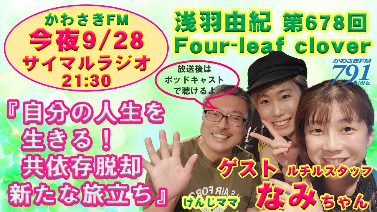 【 今夜★9/28(火)21:30〜FMラジオ放送 】『 自分の人生を生きる!と母娘の共依存から脱却し旅立つなみちゃんのお話 』■しかくかわさきFM「浅羽由紀Four-leaf clover♪」■しかくネットで聴ける♪