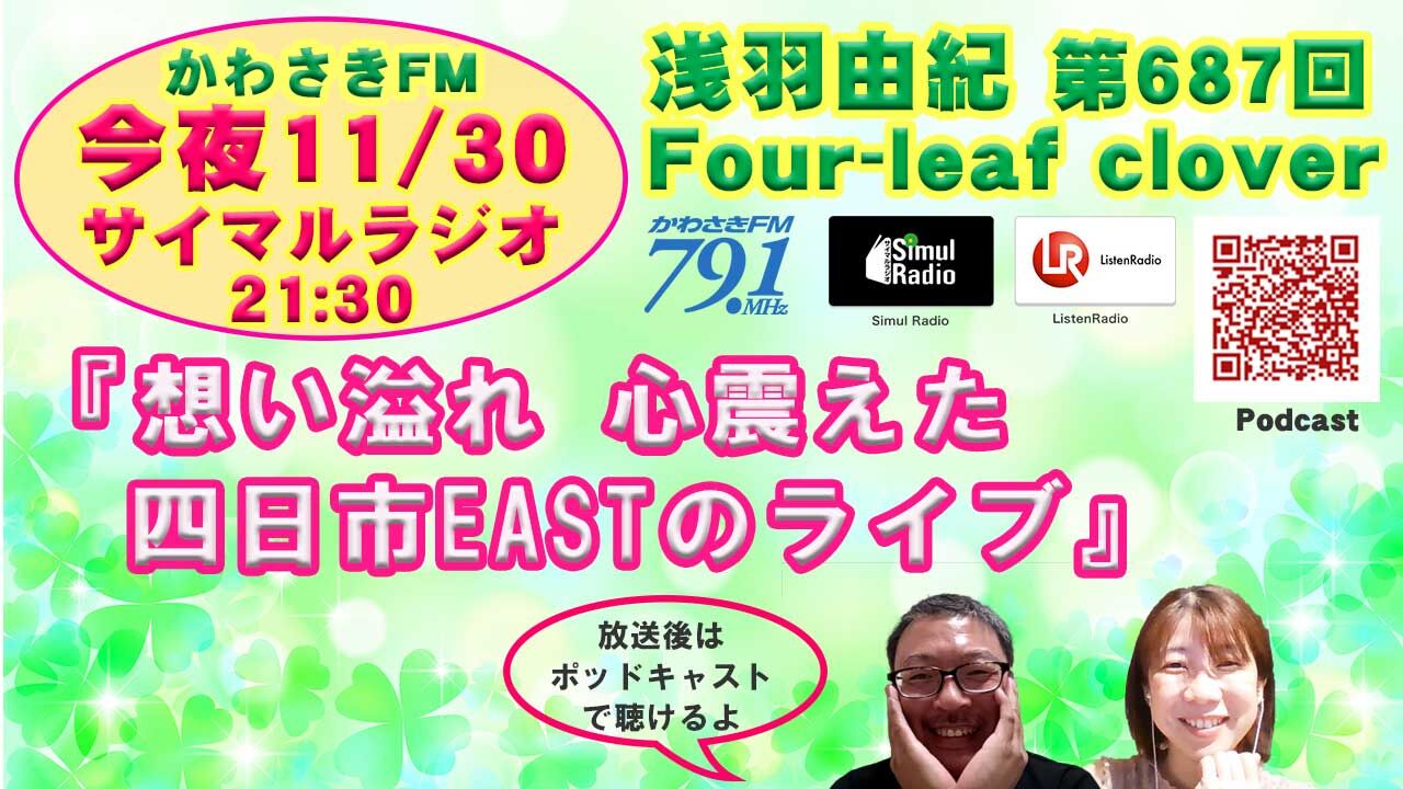 【 今夜★11/30(火)21:30〜FMラジオ放送 】『 想い溢れ、心ふるえた、四日市EASTライブ 』■しかくかわさきFM「浅羽由紀Four-leaf clover♪」■しかくネットで聴ける♪