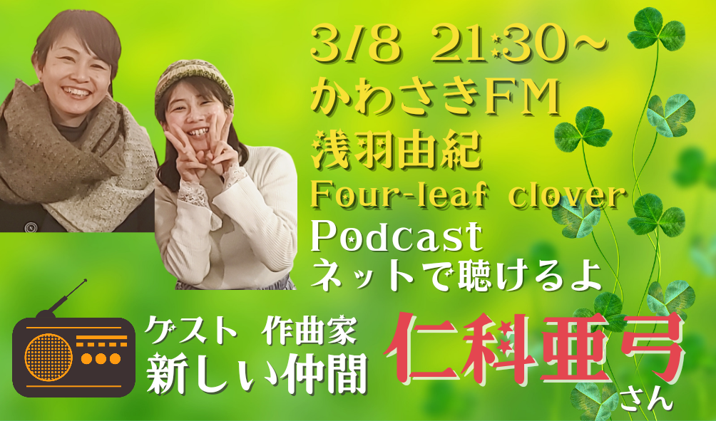 【 今夜★3/8(火)21:30〜FMラジオ放送 】『祝☆700回記念月間★ゲスト:仁科亜弓さん〜』新しい仲間ができました!■しかくかわさきFM「浅羽由紀Four-leaf clover♪」■しかくネットで聴ける♪