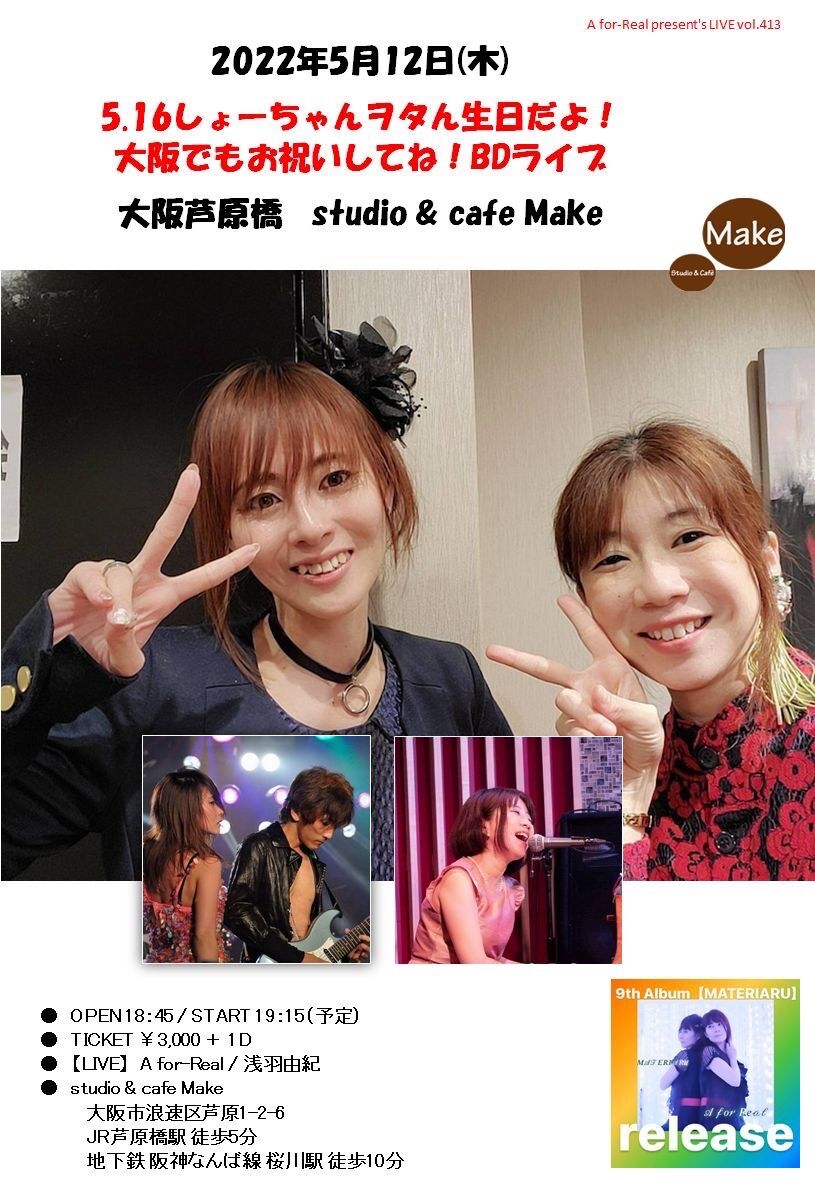 【 本日5/12(木)★大阪ライブ!<ご予約受付中> 】一緒にA for-Real庄司みずきちゃんお誕生日お祝いしましょう!★芦原橋studio cafe&make〜★19:15★A for-Real・浅羽由紀★ご予約→asabayuki1205@gmail.com