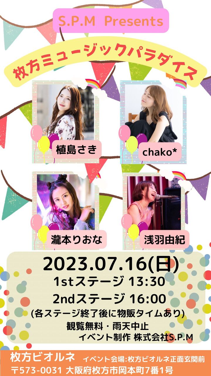 【 明日7/16(日)★大阪 枚方ビオルネフリーライブ♪ 】『 枚方ミュージックパラダイス 』 ★13:30 / 16:00 ★植島さき・chako*・浅羽由紀・瀧本りおな