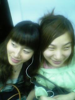 電車の中で、仲良く音楽鑑賞としゃれこんでます( ?^ ?)