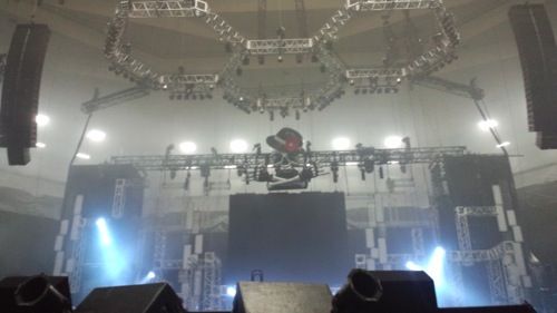 写真はリハーサルのときです。メンバーはまだおりませんが、今回、このステージを仕込むのに前々日からスタート。本格的な仕込みは前日の朝から行なっていましたが、花道やバックにあった鉄骨などの物量も多く、時間内に組み立てが終わるかなどあったようです。でも、特に本番に影響することはなく無事にライブを行なえました。このステージを組んでいるときは、ヘルメットをしている人たちが大勢で取り掛かるのですが、いつ見ても何かの工事現場のように見えます(すみません...;;)