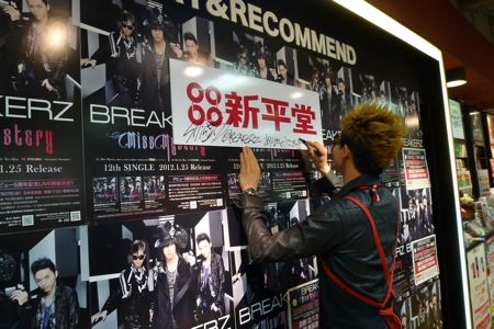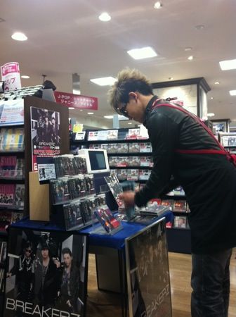 SHINPEI氏がBREAKERZの棚でチラシを整理しています。
