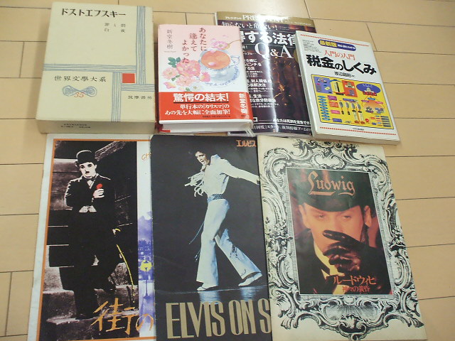 あと、また本関係ね。私の大好きなチャップリンの「街の灯」の「映画パンフ」ドストエフスキーの「罪と罰」から、「税金の仕組み」まで(笑)