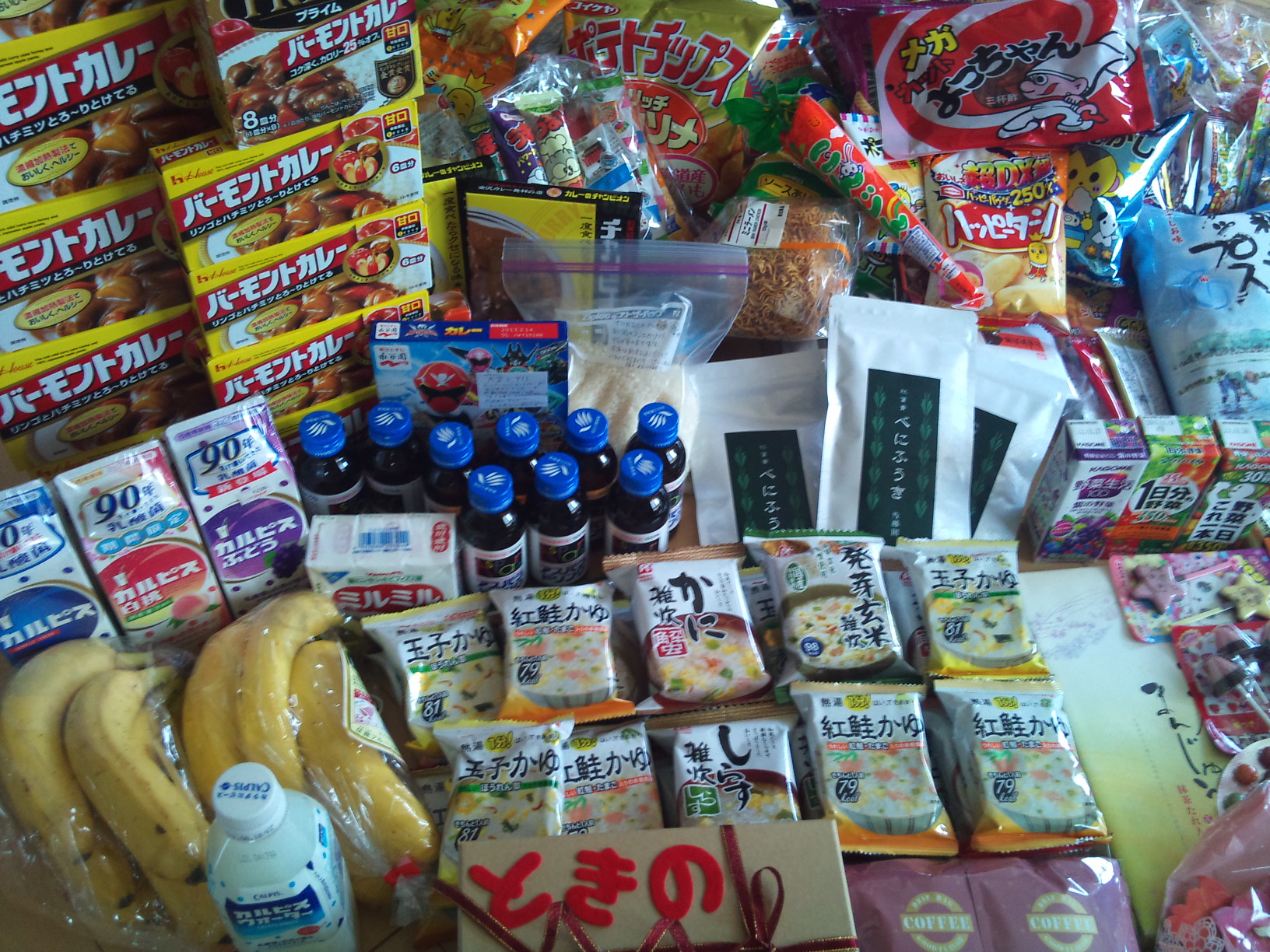 カメラのフレームに収まりきらない程の沢山の差し入れ、ありがとうございました!浮いた食費は義援金に足しときま〜す!(⌒∇⌒)