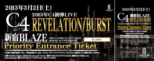 当日オープニングアクトを務めるPLUNKLOCKを応援して下さっている方々、もしくは興味がある方は、本来C4のワンマンであるところに後付けで彼らを応援する意味で結構な力技で入れている都合上、開場時間18:00から15分後の18:15から[-REVELATION/BURST-]開演時刻の18:30から5分過ぎの18:35までの演奏時間となってしまいますが、何卒ご斟酌のほど、よろしくお願いします。
