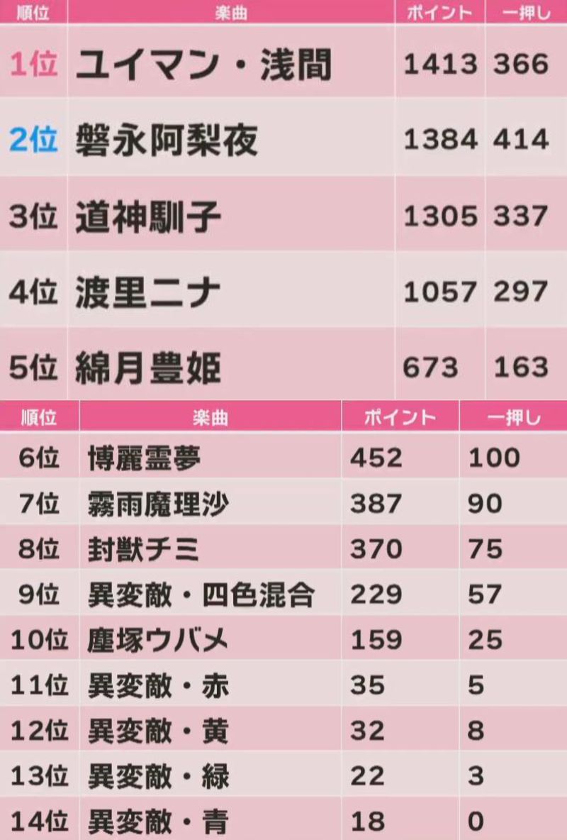 東方錦上京オンリーの人気投票結果が公開