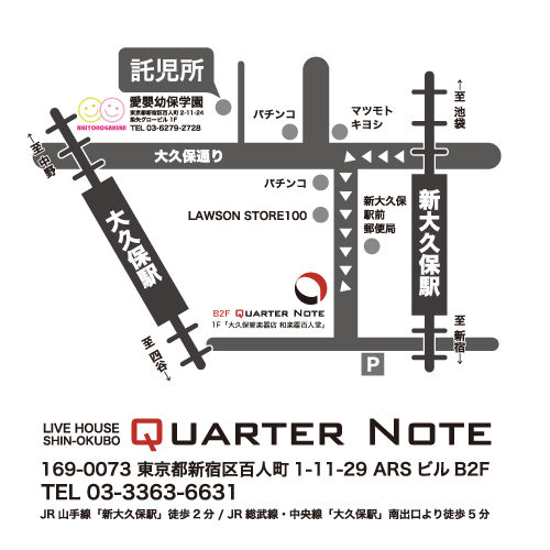 このビルのB2Fが「新大久保Quarter Note」となります。