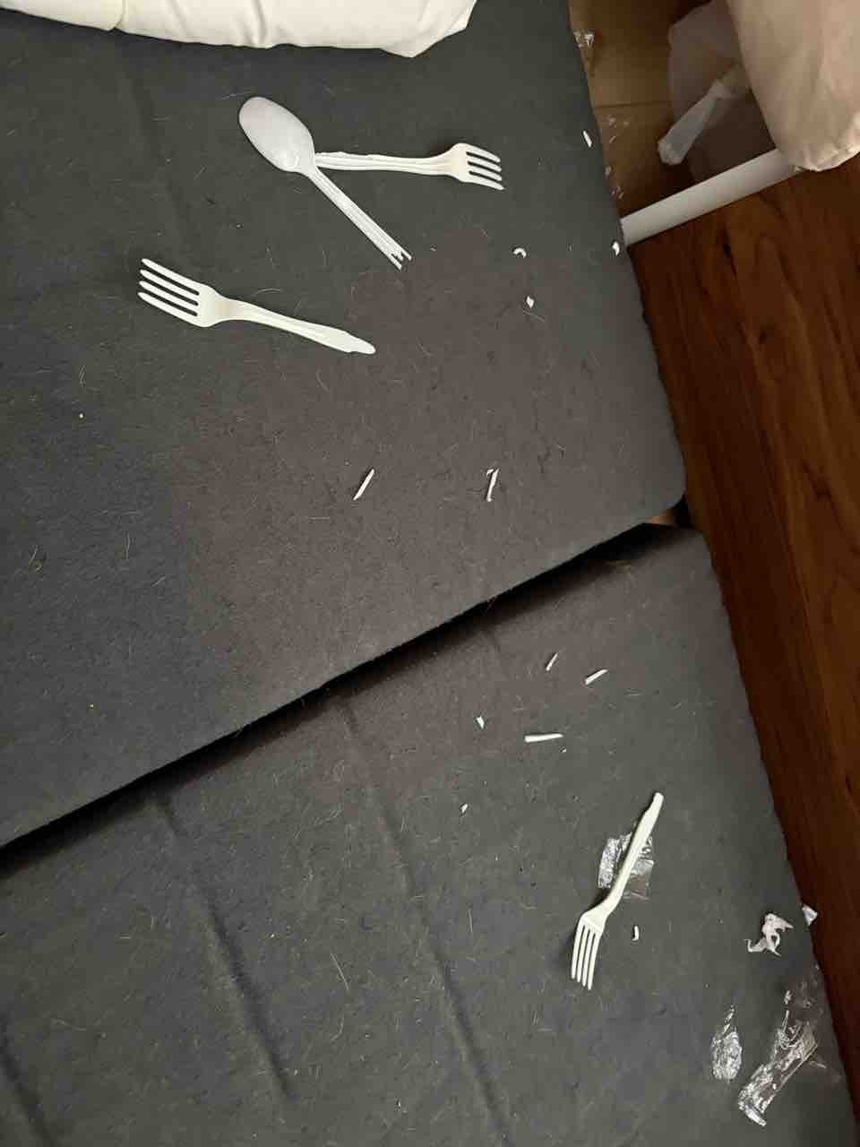 なんか足元がチクチクするなー思ったら、ストックで置いてたフォークたちをわざわざ、わざわざ、わざわざ!!僕の足元まで持ってきて、そこでバリバリと噛み砕いてくれていました。