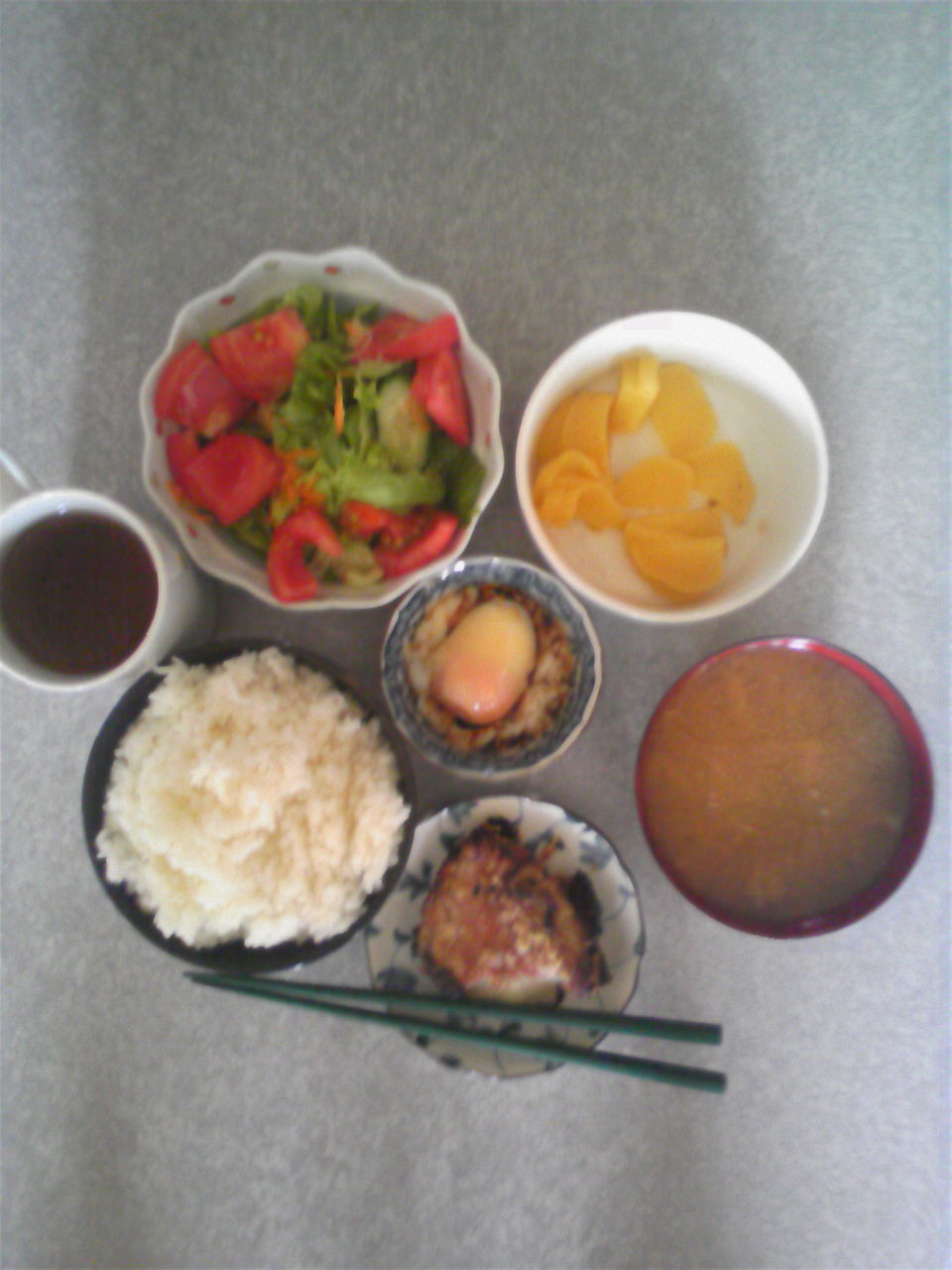 メニューはご覧の様な感じで、たっぷりの野菜とみそ汁ご飯...。それに気分によってハムエッグにしたり、お魚を焼いてみたり...。