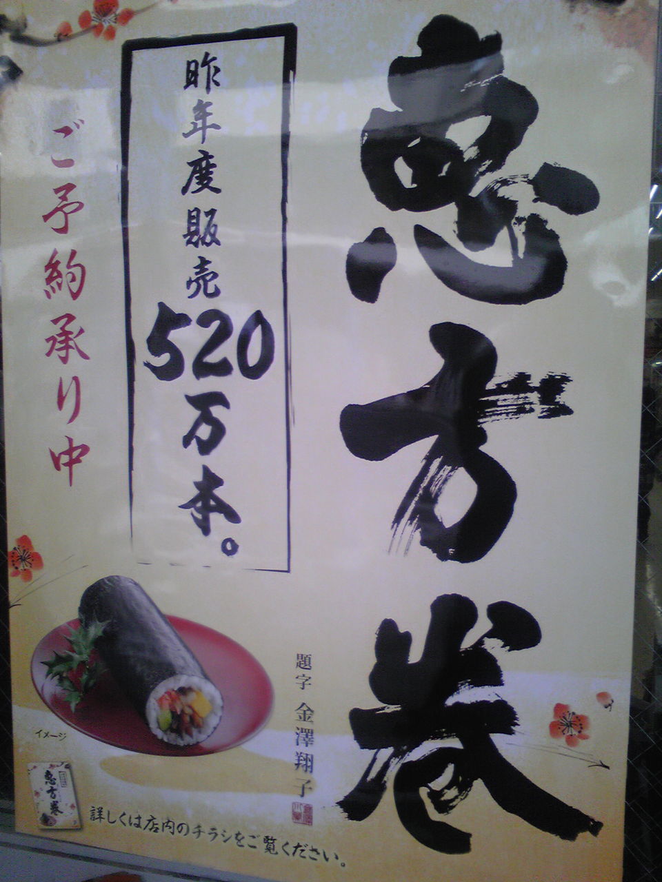 ちなみに、この恵方巻き、大阪地方の海苔の問屋協会が、地元のお寿司屋さんと組んで、海苔の販売促進の為に行った様々なイベントが、広くマスコミで取り上げられられて話題になったことが、全国的に知名度を上げるきっかけとなったということです。
