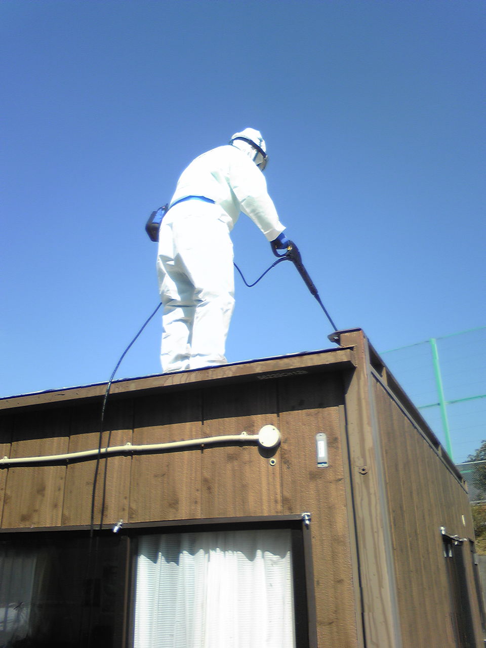 屋根に続いて壁面、そして、最後は地表に至るまで慎重に電解水素水の噴射が行われます。