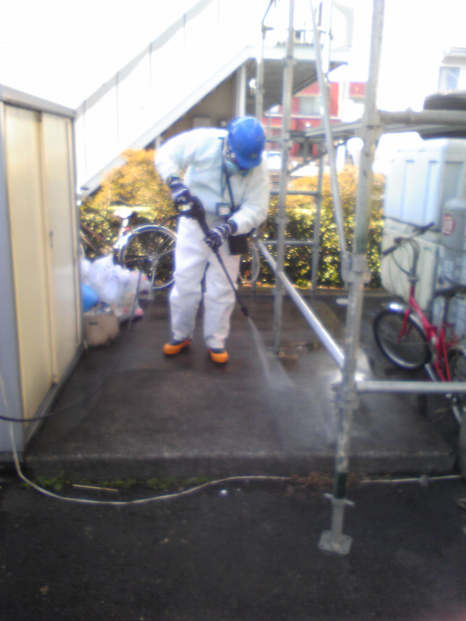 大型タンクに入れられた電解水素水を、高圧洗浄機を使って洗浄面に噴き付けるという作業です。
