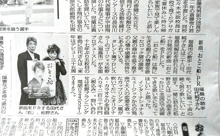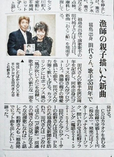 昨日の福島民報新聞さんに続いて、今日は福島民友新聞さんに田代純子の新曲『おとこ船』のPR記事を掲載して頂きました。