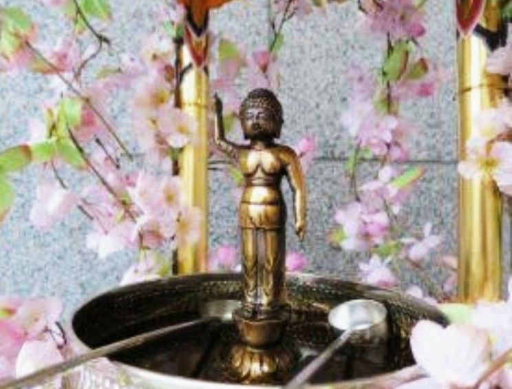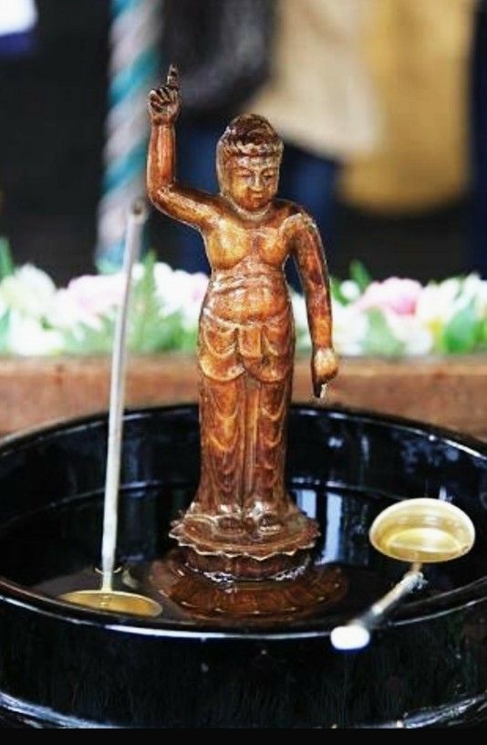 甘茶を灌ぐ風習は、お釈迦様が誕生した時に、産湯を使わせる為に九つの竜が天上から清浄の水を注いだという伝説に由来しているということです。