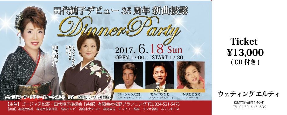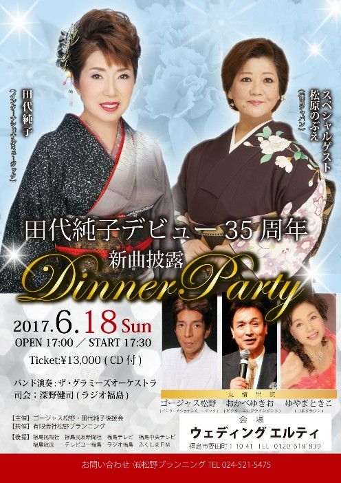 曲目も、ディナーパーティーにスペシャルゲストとしてお迎えしている松原のぶえさんの新曲『十勝厳冬』、私のオリジナル『おまえのバラード』、そして田代純子の新曲『おとこ船』をフルコースでご紹介頂きました。