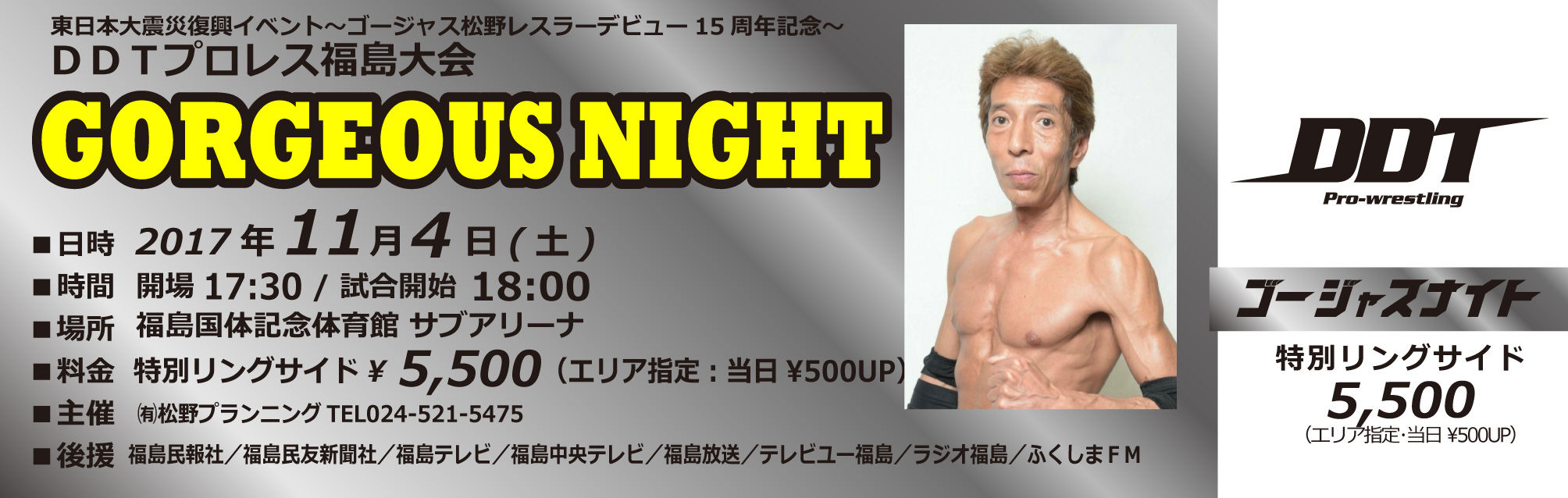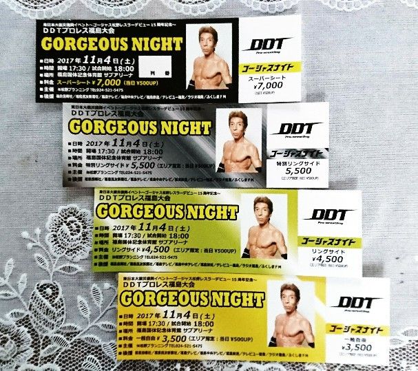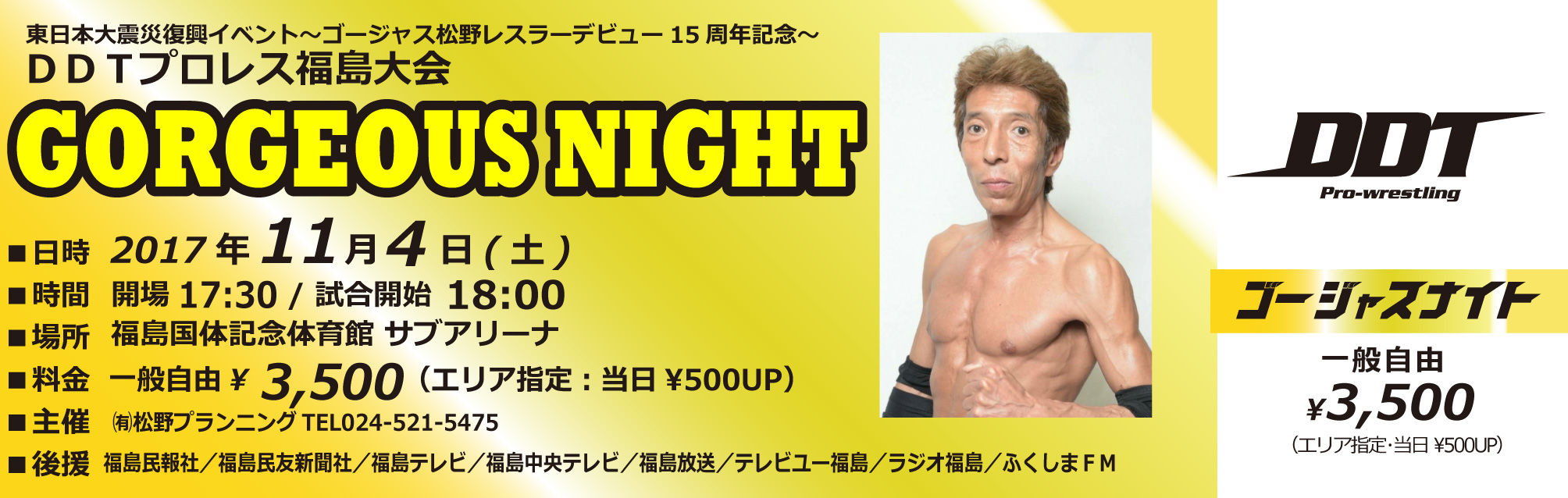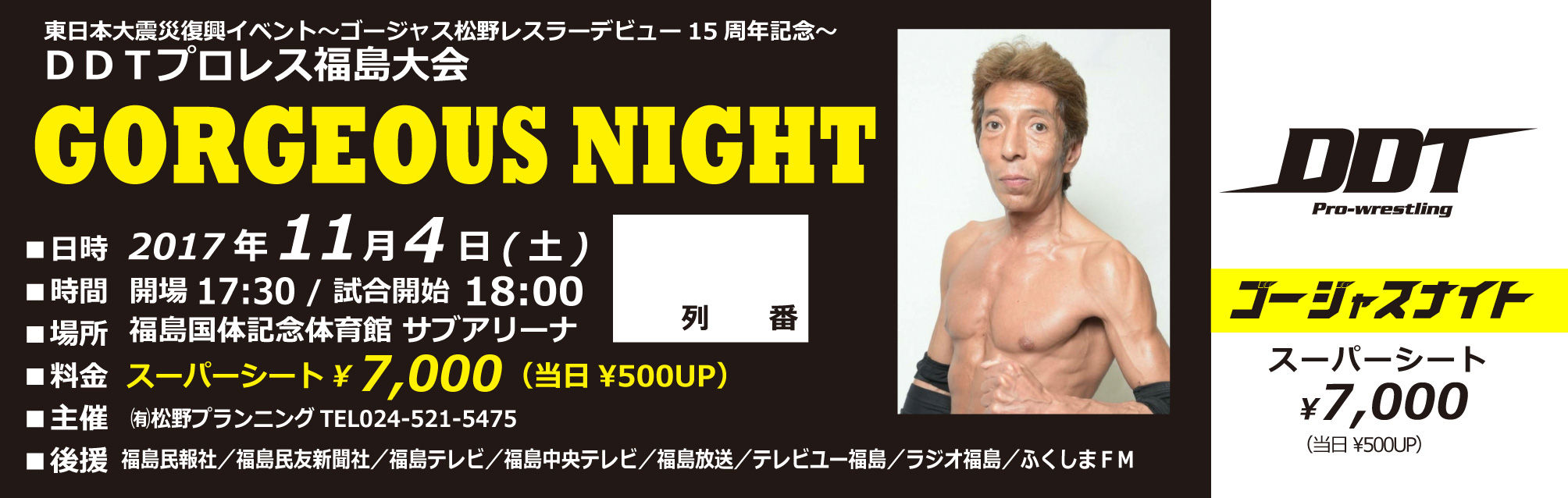 DDTプロレス福島大会『ゴージャスナイト』のチケットは、只今絶賛発売中です。