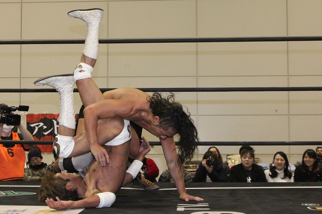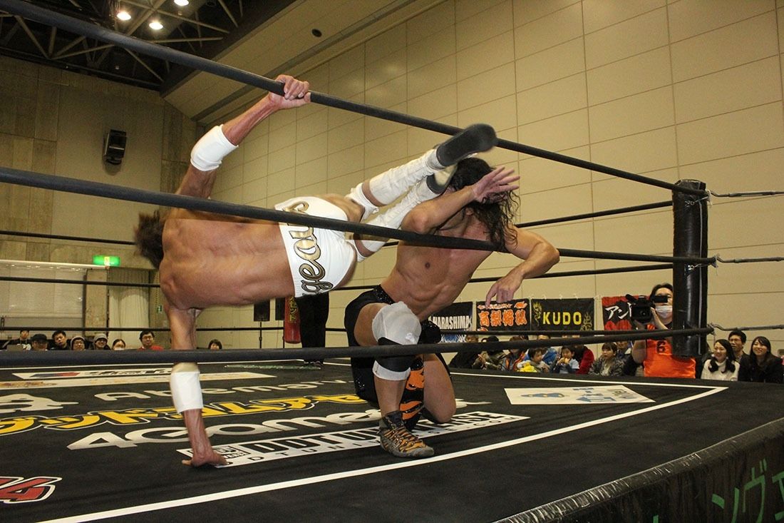 コーナーで腹ばいにセットされて坂口の串刺しランニングニーと攻め込まれカバーされるが、竹下&彰人のカットで助かり坂口へ渾身のクロスチョップ。