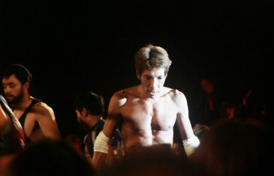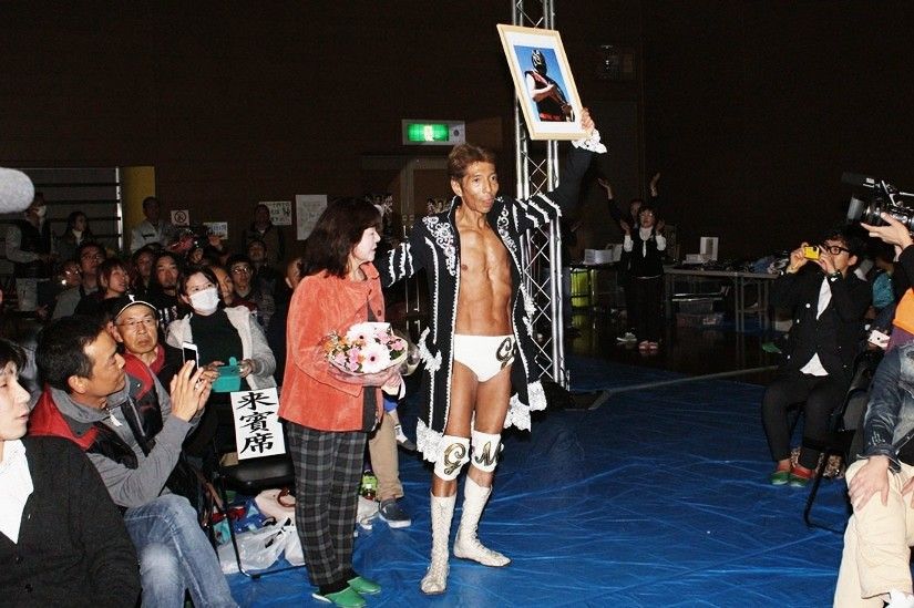 わらじまつりの皆さんに見送られてリングに向かった私は、客席から見守っていた盟友・故ブラック牛マンさんの遺影を掲げてリングイン。