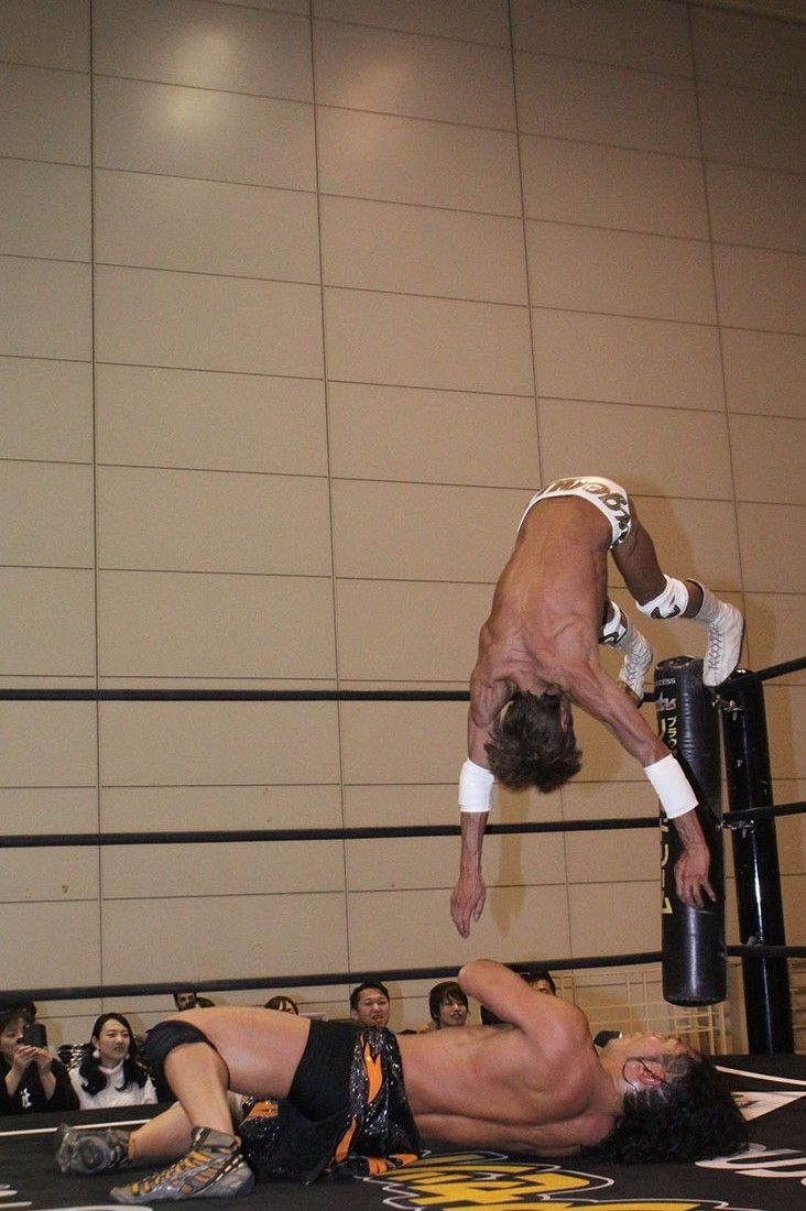 苦しい中、高梨の串刺し攻撃をかわし、岩崎ともどもコーナー反転ボディーアタックで潰してようやくピンチを抜け出す。