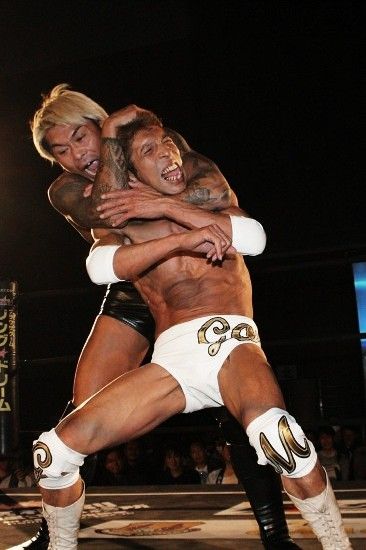 竹下にスイッチ・・・彰人のMAO殺しから竹下がブルーサンダー、私がゴージャスエルボーに繋いで竹下がカバーするもカウント2。