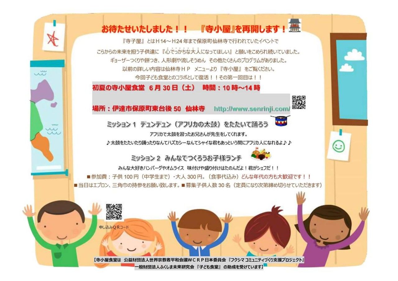 約5年振りの開催となった今回は、『初夏の寺小屋こども食堂』と銘打たれ、第一部『デュンデュン(アフリカの太鼓)をたたいて踊ろう! 』、そして第二部『みんなでつくろうお子様ランチ 』の2つのプログラムが行われました。