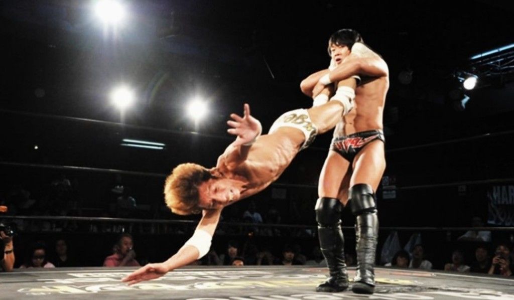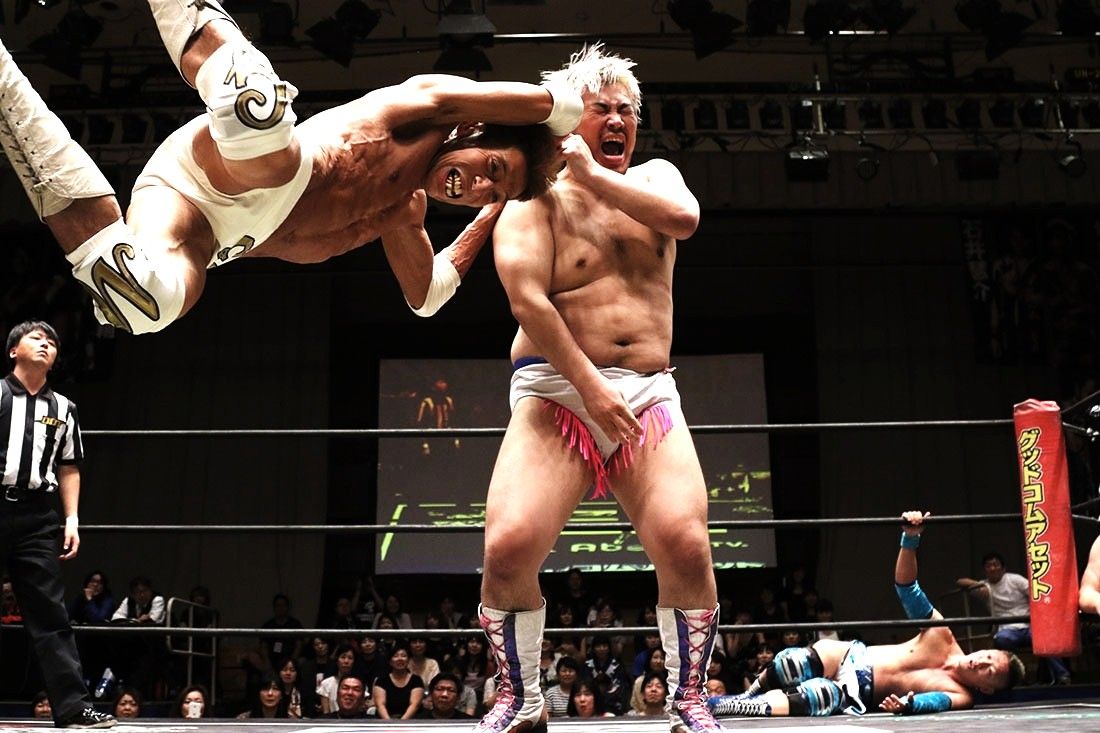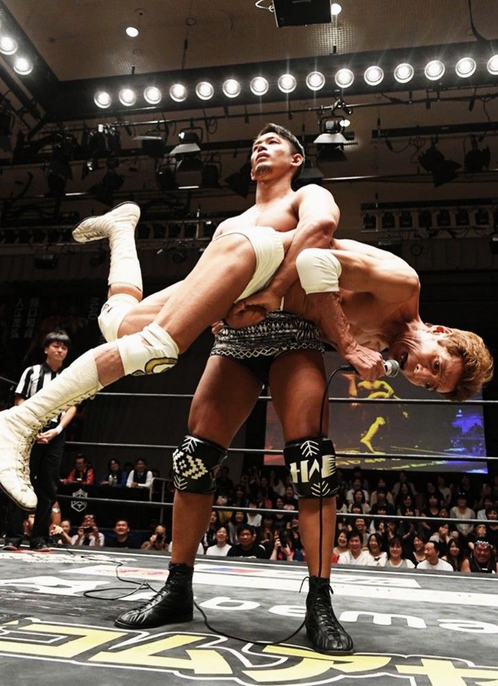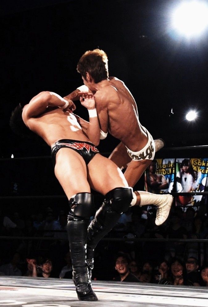 仕切り直して腕の取り合いから遠藤をホイップで投げるが、遠藤はヘッドロックで切り返しショルダータックル。