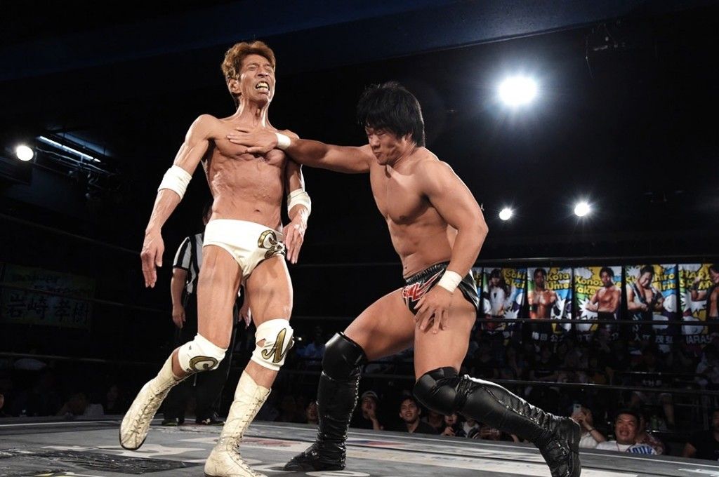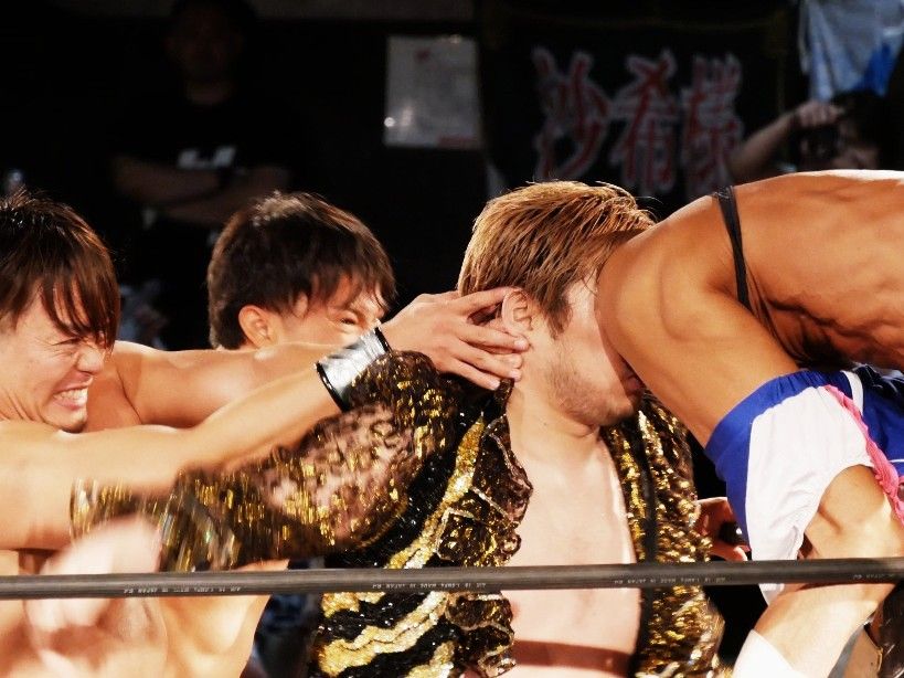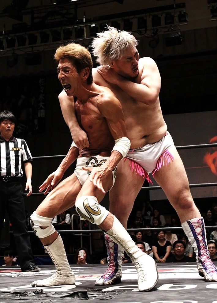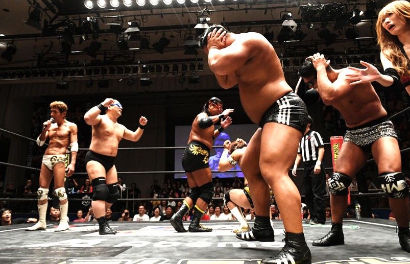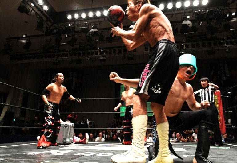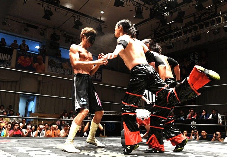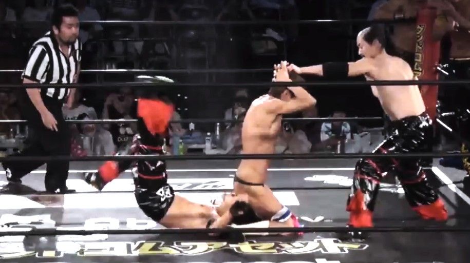 ギリギリでストップしたHARASHIMAとKUDOは突進してきた太った松野の顔面をバキバキのディーノの尻に押し込むと、KUDOがバックスピンキック・・・そこにHARASHIMAが蒼魔刀をブチ込んで3カウント。