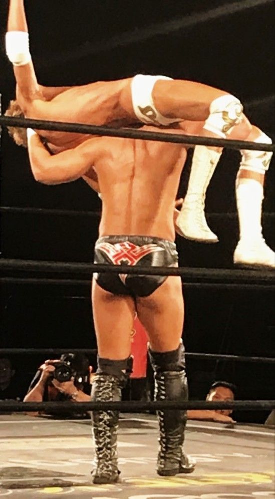 バキバキのディーノはコーナーに登り、漢タイツを下げて地獄門の体勢・・・そこにHARASHIMAとKUDOが太った松野をホイップしようとするが、太ったディーノは逆にKUDOとHARASHIMAをホイップ。
