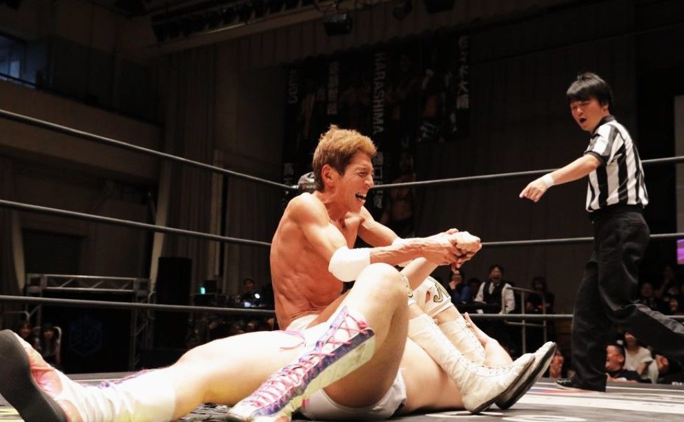 遠藤が切り返して私をコーナーに乗せてアルゼンチンバックブリーカー、これを逃れて十字架固めに切り返すがカウント2。