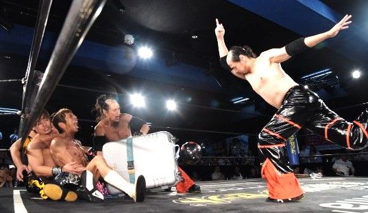 リングに戻り、バラモン兄弟は、KUDO、HARASHIMA、そしてバキバキのディーノを座らせてボーリング攻撃を見舞い「ストライク!」。