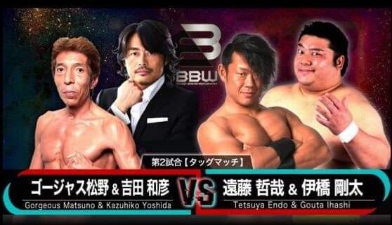 私の試合は、遠藤哲哉&伊橋剛太 vs ゴージャス松野&吉田和彦のタッグマッチでした。