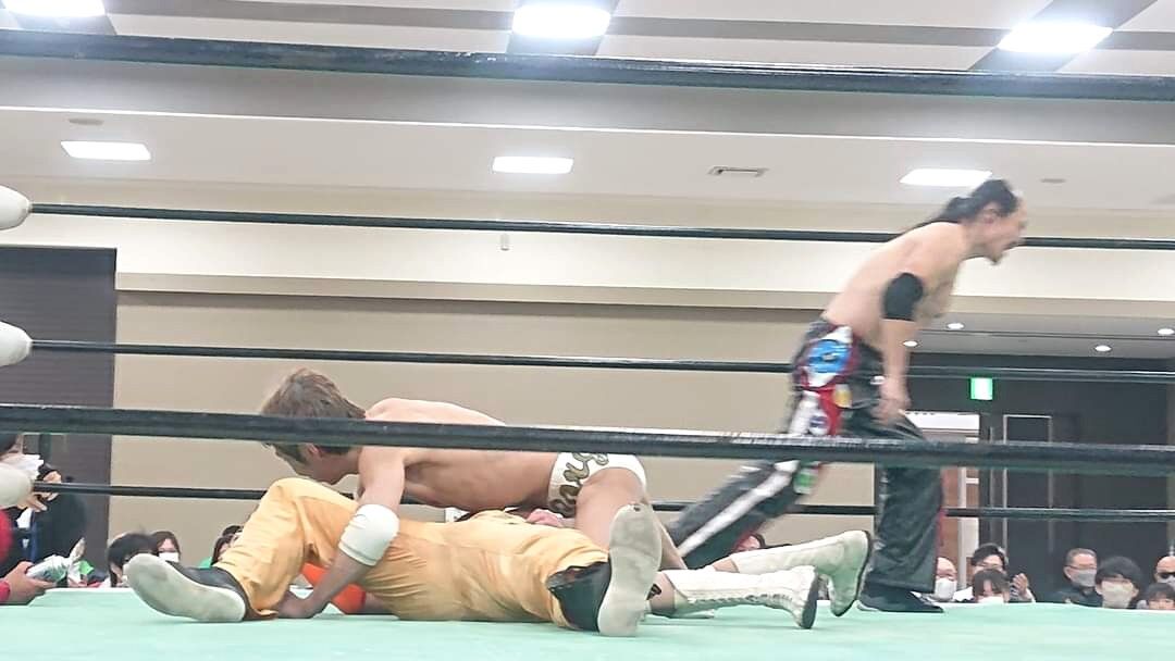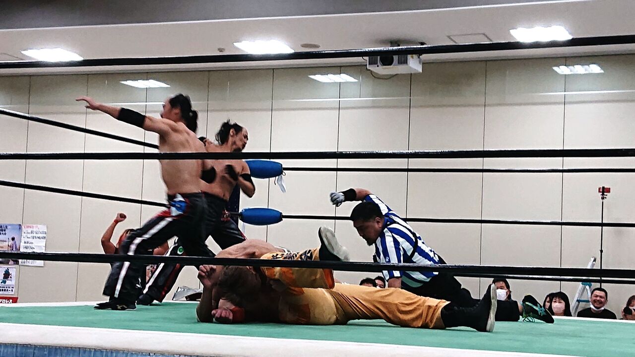 予想以上に奇想天外な攻防を繰り広げた末、最後はバラモン兄弟の援護射撃を受けて、グレートサスケ選手からめでたく3カウントを奪うことが出来ました😊