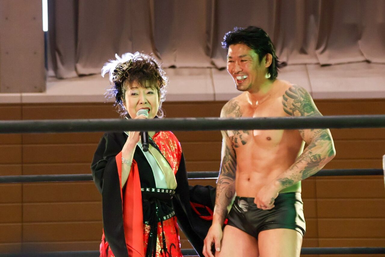しかし、唄い終わりで2人に背後から襲われ、4番手に入場してきた高梨選手が救出。