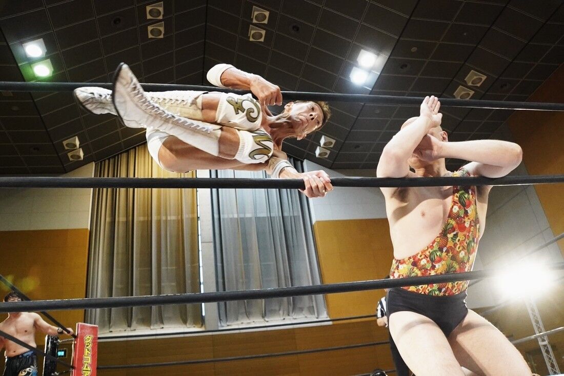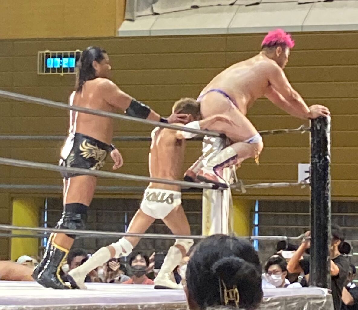 以後、高梨選手のアシストでゴージャススーパースターエルボーを3回発射しましたが全てかわされて、最後は全員にホールされて3カウント😅